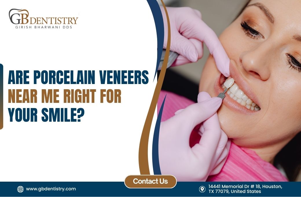 Porcelain veneers near me cost varies depending on factors such as the number of veneers, tooth preparation complexity, and material quality. At GB Dentistry, we offer competitive pricing reflective of advanced technology and expert care provided by Dr. Bharwani. For Memorial and nearby residents, we provide clear consultations detailing porcelain veneers cost and flexible financing options to support your investment in a long-term smile makeover tailored to your goals.