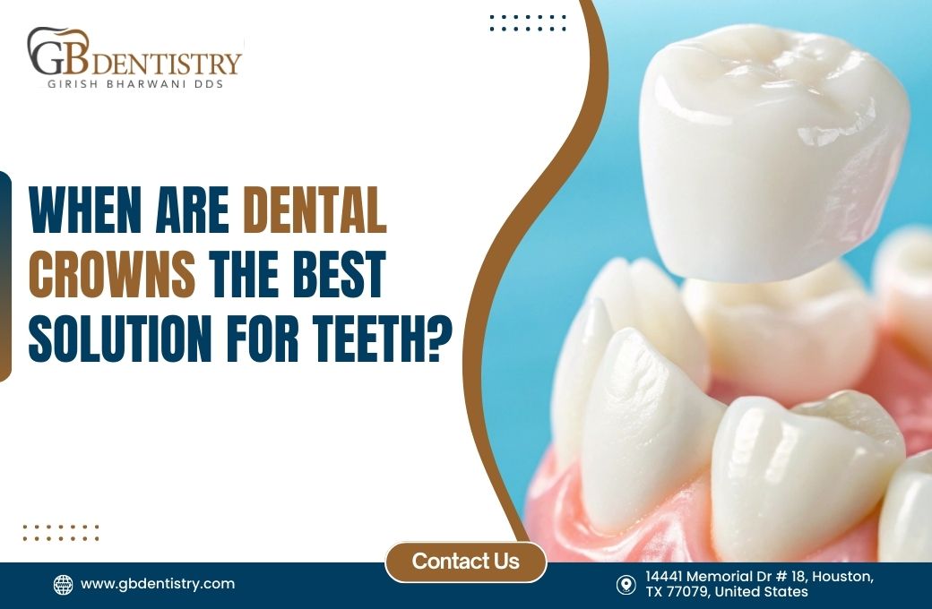 crowns are essential when a tooth is significantly damaged or weakened. Common reasons include large cavities that cannot be restored with fillings alone, cracked or fractured teeth, teeth that have undergone root canal therapy, and severely worn or misshapen teeth. At GB Dentistry, serving Memorial and nearby areas, crowns protect and restore the function and appearance of compromised teeth. They provide structural support and help prevent further damage, making them a versatile solution in various dental restoration cases.